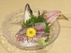 まるまる一尾を素早く三枚におろし、中骨を帆掛けに、皮を剥いた紅白肌の切身は、歯ごたえ素晴らしく、みずみずしい透明感、上品な脂。