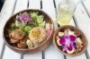 ボウルの中にガーリックシュリンプやご飯、サラダなどが入っていて、お好みのドレッシングやホットソースなどを入れて好みの味で食べることができます。